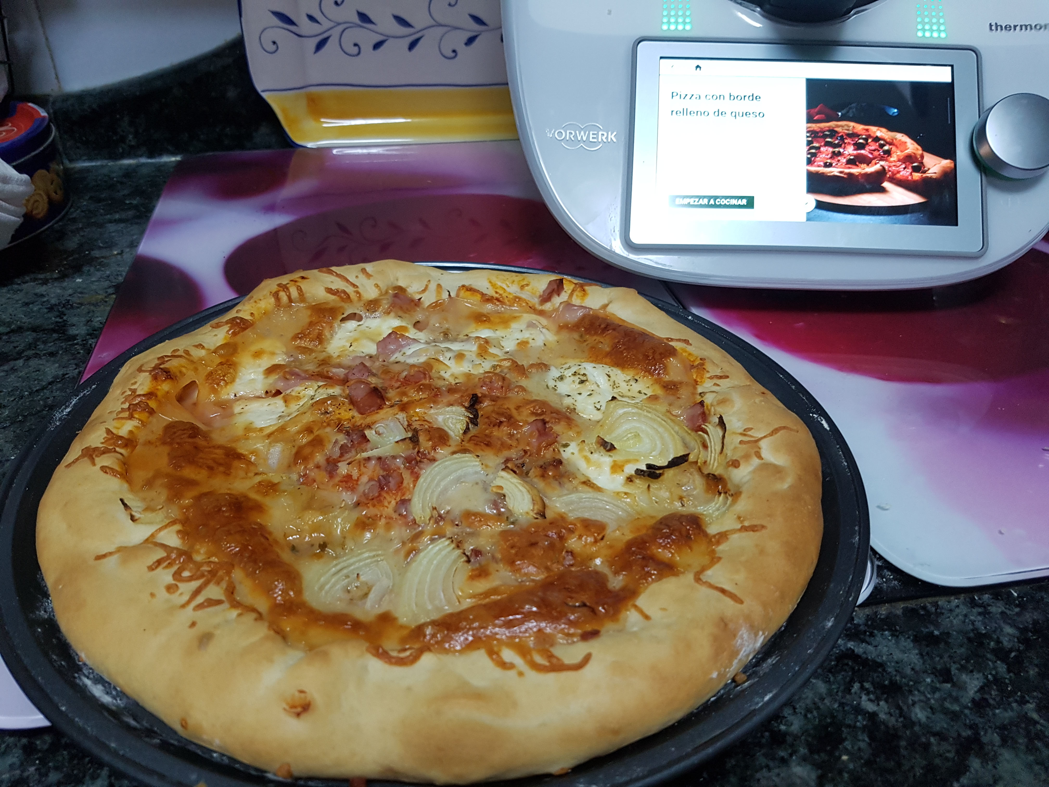 Hay que buscar en cookidoo " Pizza con borde relleno de queso" sale genial, el relleno se puede cambiar los ingredientes, quedando igual de espectacular o más...la mia lleva la mozzarella en rodajas y cebolla en aritos...pruébala.