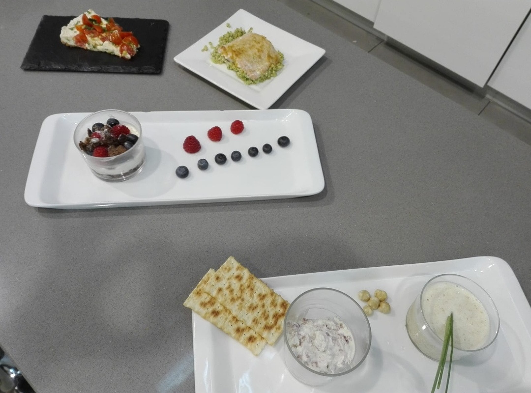Sirva el Dip cremoso de jamón y el Ajoblanco de avellanas con compota de manzana de aperitivo. La Tarta de tres quesos y tomates cherry de entrante.