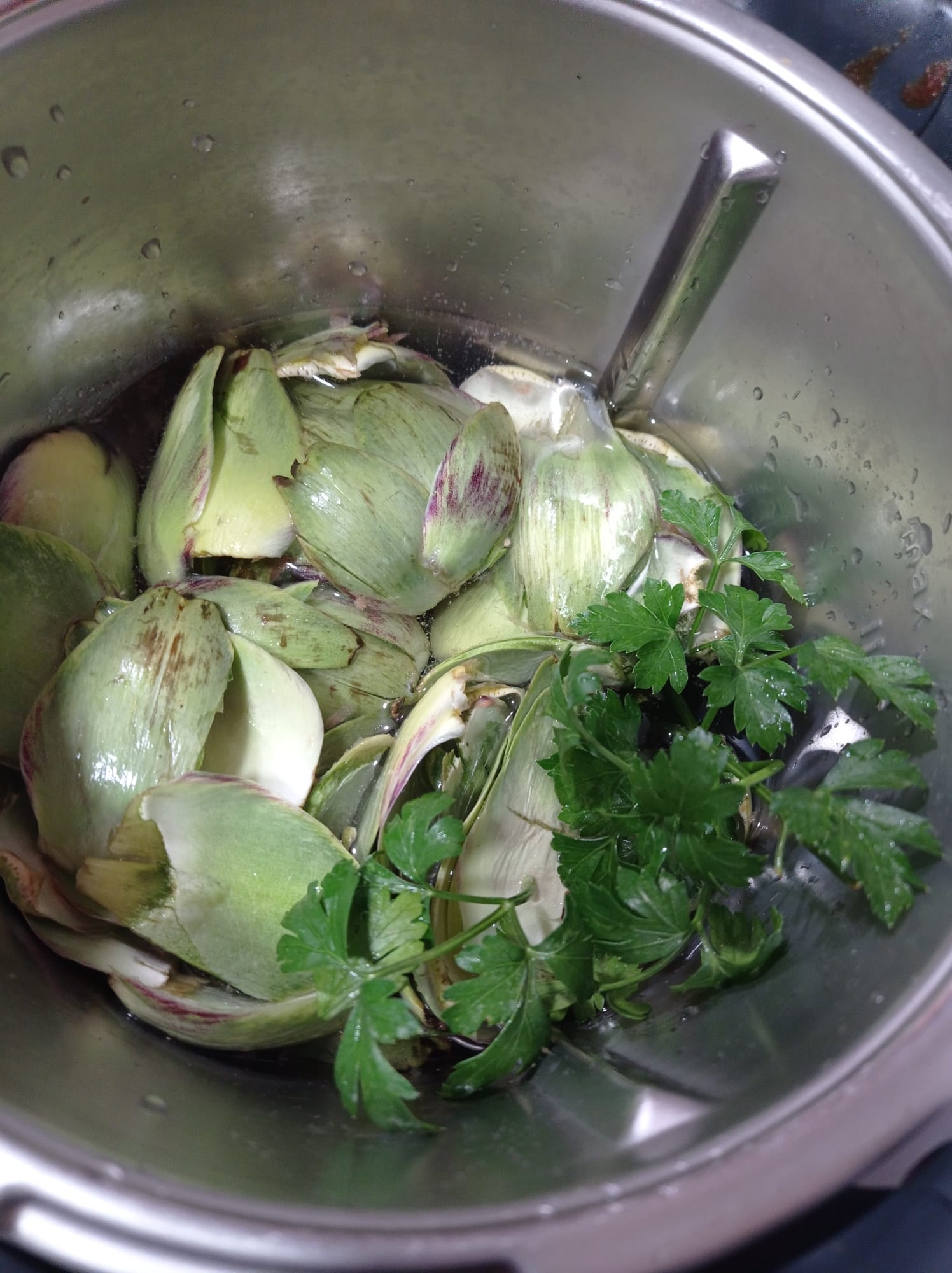 1. Retiramos las hojas de alcachofas muy bien lavadas, y colocamos en el vaso. Añadimos el agua y el aderezo opcional y programamos 20 min/100º/vel 2. Una vez acabado el tiempo, dejar reposar 5 minutos.