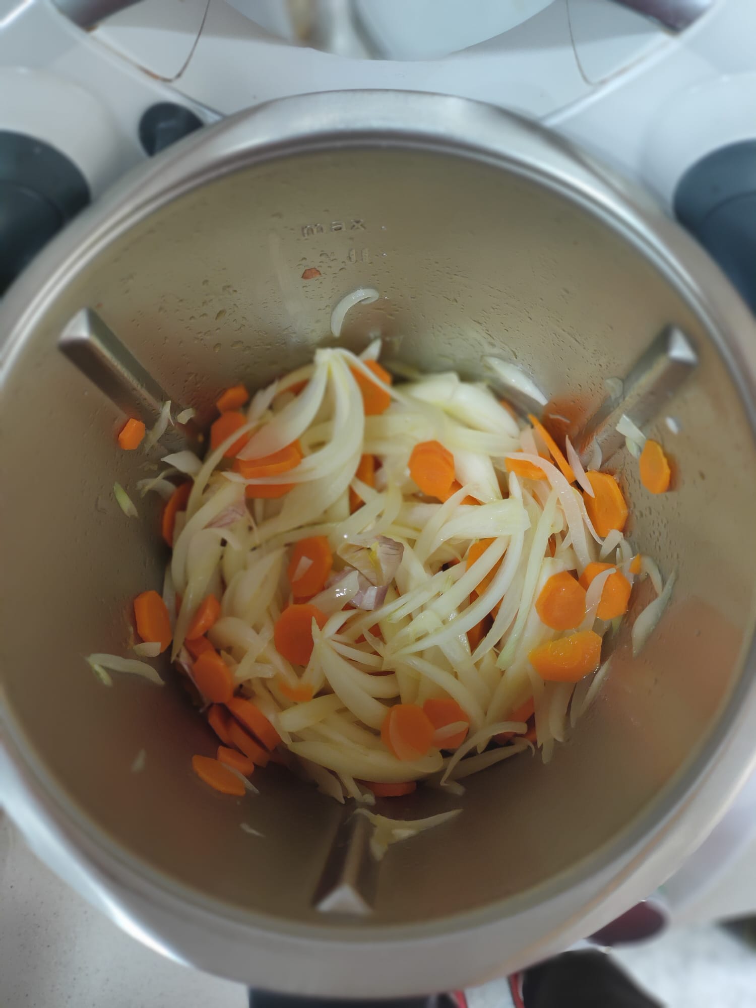 Ponga en el vaso el aceite, la cebolla, los ajos y la zanahoria. Rehogue 7 min/100°C/vel cuchara.