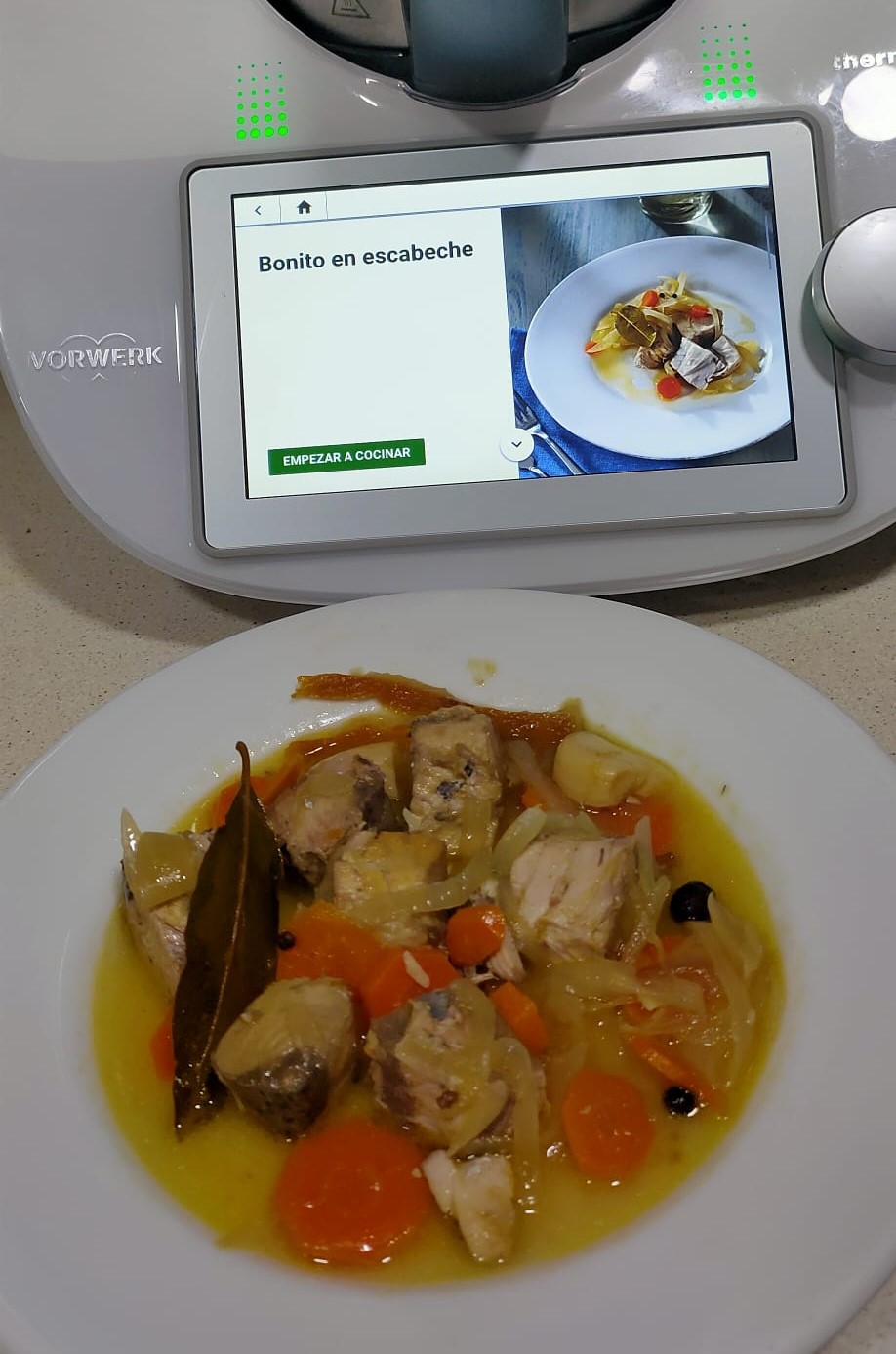 Programe 15 min/Varoma//vel cuchara . Retire el bonito a un tarro o recipiente hermético. Incorpore el escabeche del vaso y deje enfriar. Reserve en el frigorífico. El escabeche mejora si se deja reposar 24 horas.